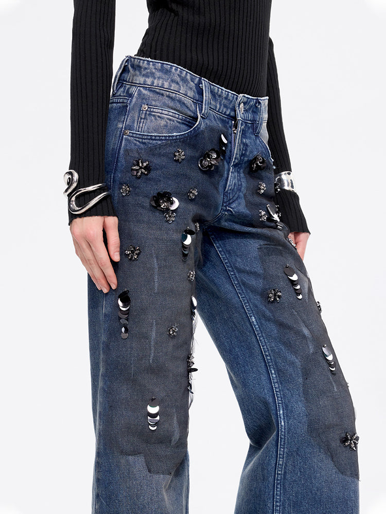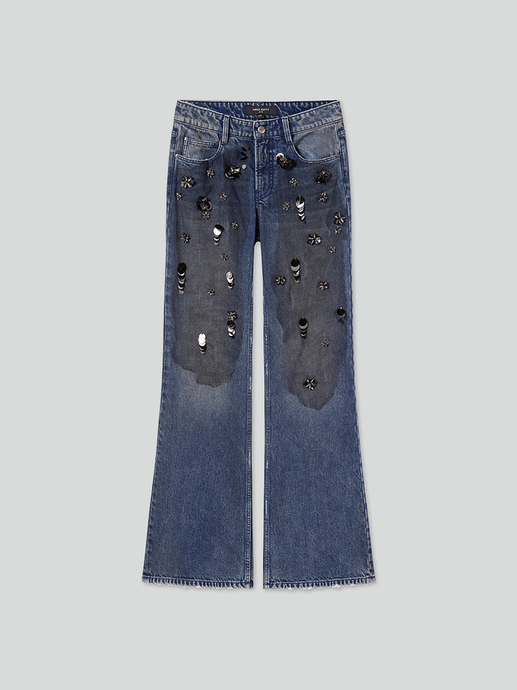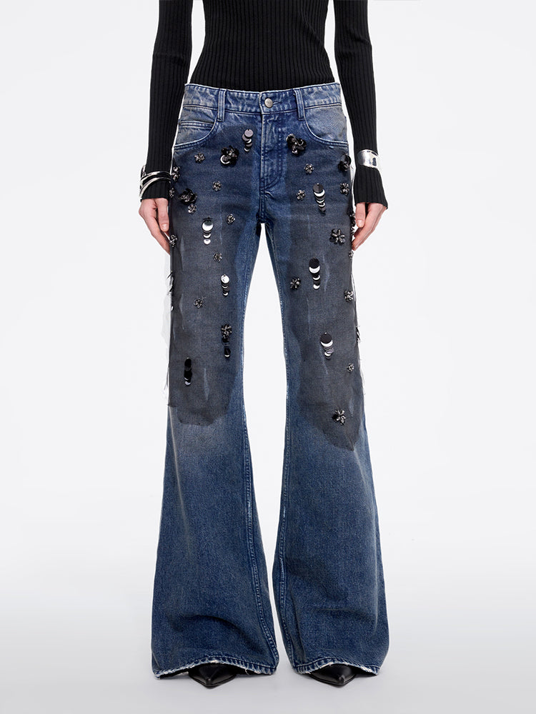 This garment is made from premium pure cotton denim fabric, featuring subtle vertical slub effects with clear texture lines. The fabric is structured and has a crisp, tailored feel. After undergoing multiple washing processes like enzymatic wash, hand rubbing, front whiskering, and stain treatment, it achieves a vintage look and feel. The comfortable, natural waistline is complemented by hand-sewn beaded sequins on the front, enhancing the retro charm. A deep brown embossed leather label adorns the back waist, perfectly matching the vintage-washed denim. The slim-fit, retro flared pants create a modern, bohemian vibe.