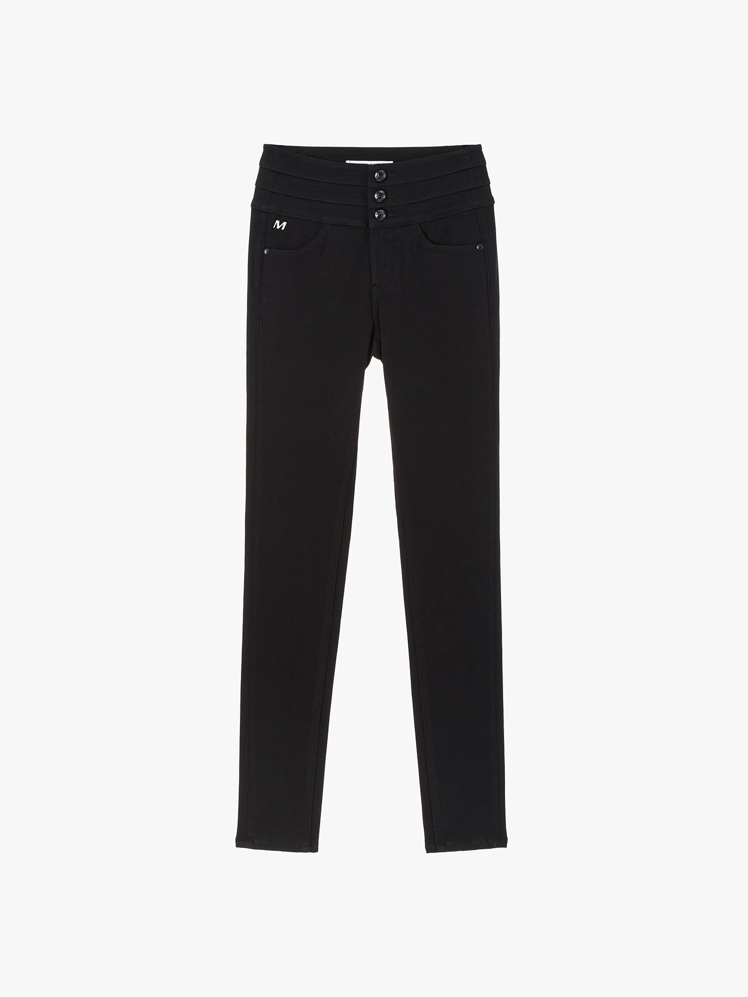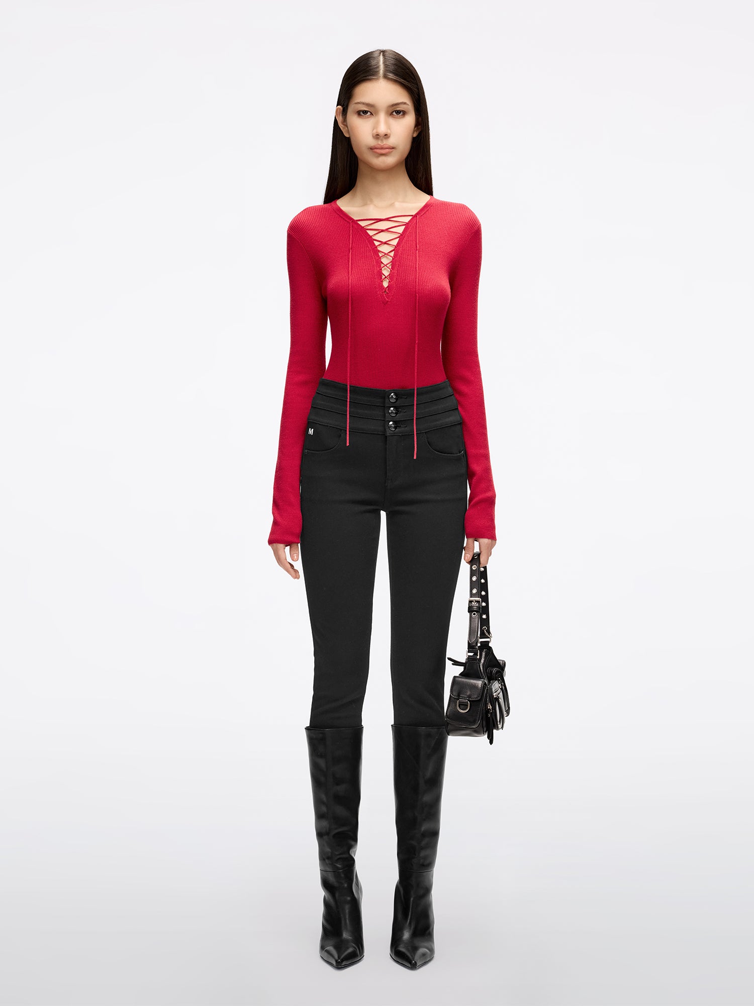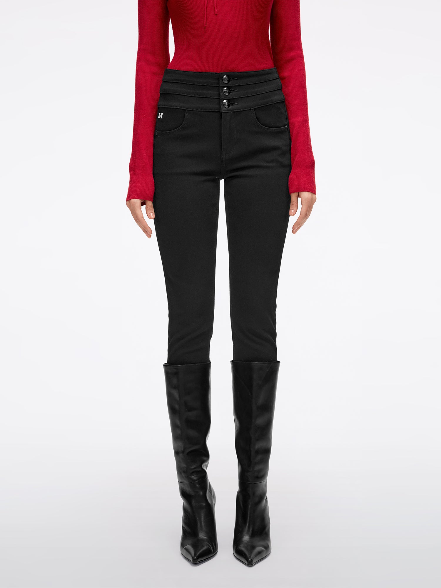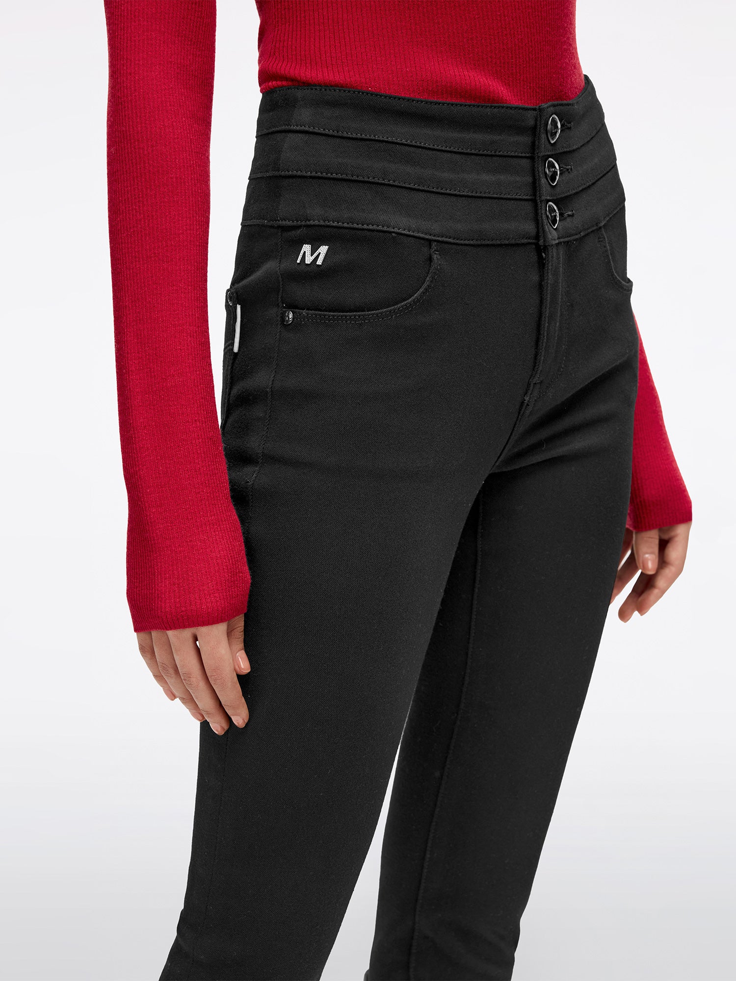 Four-way stretch denim fabric with active black dyeing, creating a deep black visual effect. Modal fibers combined with elastic fibers provide a soft and skin-friendly feel, shaping without tightness. The structure conforms to the waistline, creating a slimming effect on the waist and abdomen. Sparkling M-shaped rhinestone embellishments adorn the pockets. The slim and cropped length visually shapes and