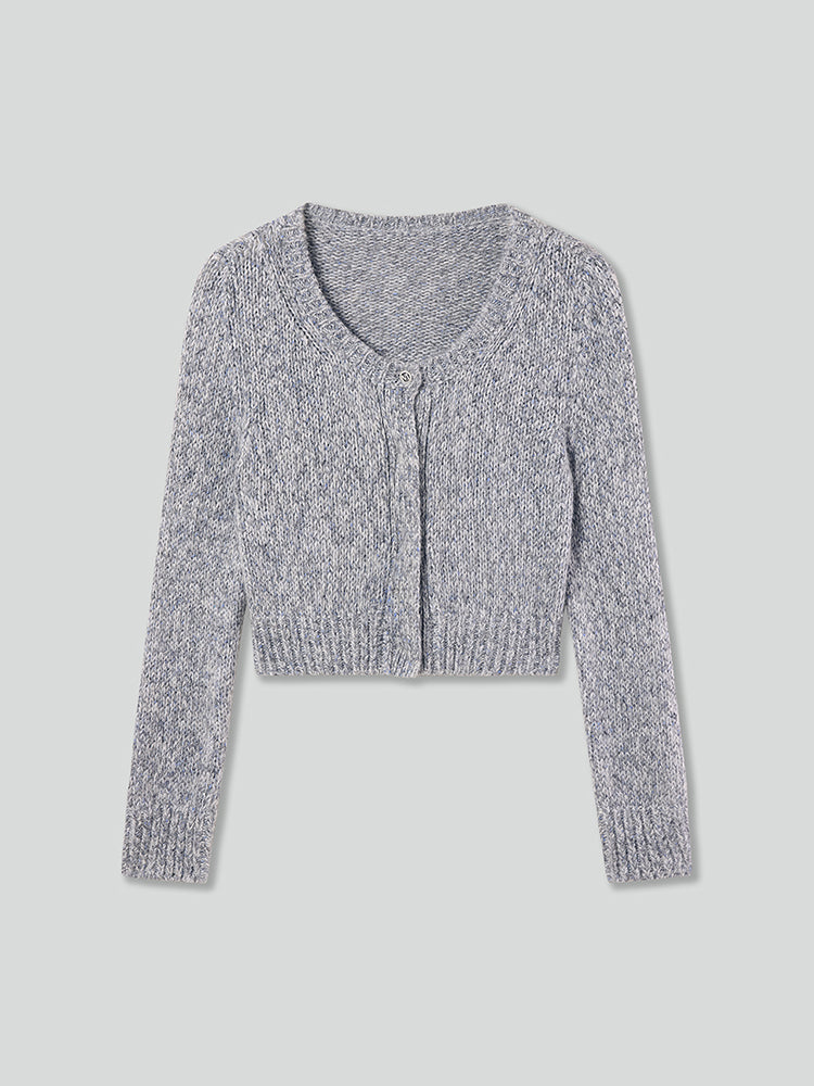 This yarn is produced in Italy, combining mohair, acrylic, nylon, and silk in a 4-in-1 blend, featuring a thoughtfully designed palette that exudes softness and elegance. The mohair lends warmth and a fluffy texture to the fabric, while the silk fibers provide a soft, skin-friendly touch and a subtle sheen. The lightweight quality creates a plush, structured appearance. The low round neckline is adorned with a sparkling "M" crystal-button accent, making it a stylish focal point. The placket features a hidden button design for a refined, minimalist look. Ribbed knit cuffs enhance the silhouette, elegantly framing the arms.