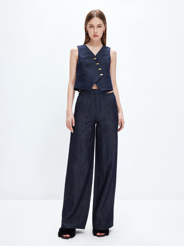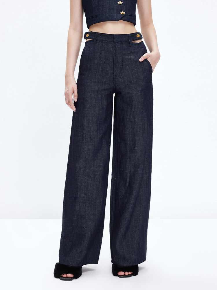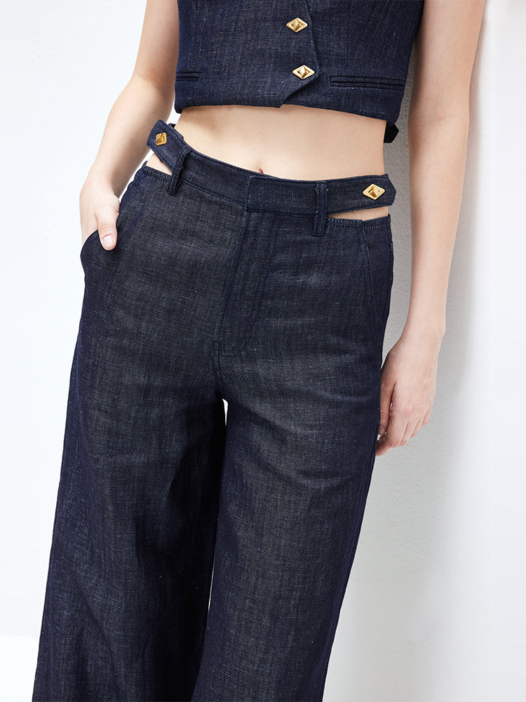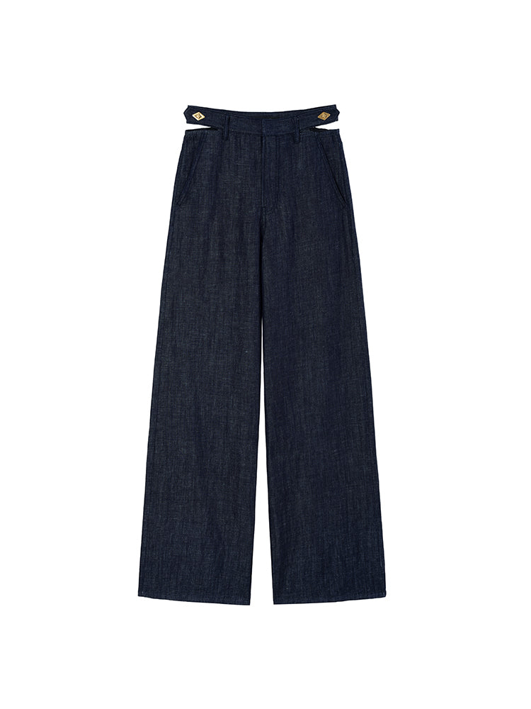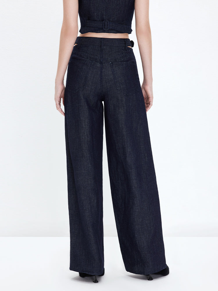 DARK BLUE CUTOUT WIDE-LEG LINEN JEANS