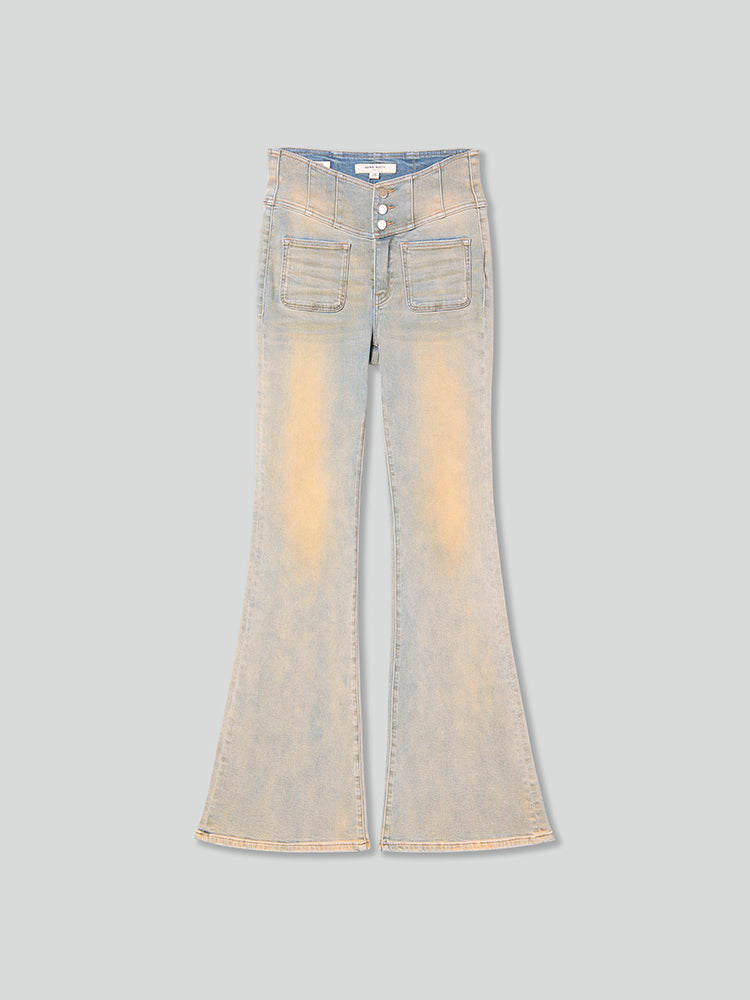 Made from high-quality cotton fibers sourced from Turkey, known for their fine length and natural sheen, the denim fabric offers a soft and comfortable wearing experience. It has a full, slightly stretchy feel with a natural drape and structure. After multiple processing treatments, the fabric reveals subtle slubs, with each piece offering a unique character, reflecting a classic vintage style. The innovative V-shaped waistline combined with multi-panel stitching fits comfortably around the waist and flatters the tummy. A textured embossed contrasting leather tag adds a stylish touch to the back waist. The classic flared pants design, with distressed details on the legs, makes each piece unique and fashion-forward.