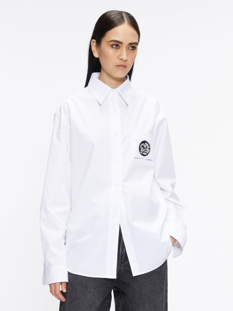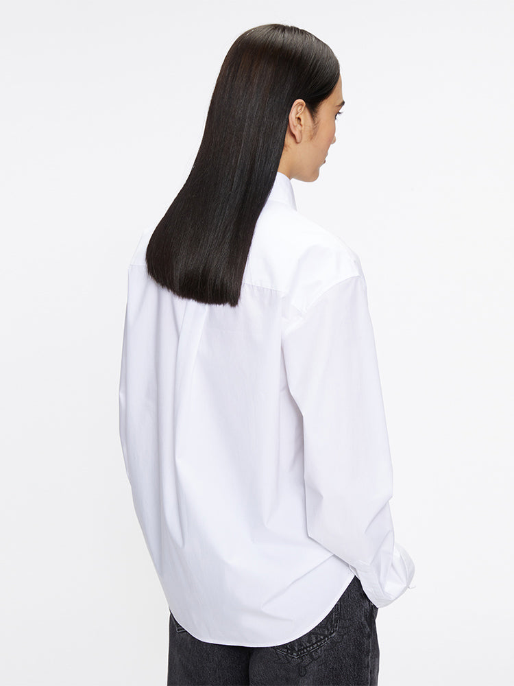 The fabric is crafted from high-quality long-staple cotton yarn, known for its longer, finer, and stronger fibers compared to regular cotton. This gives the fabric a soft yet structured feel, with a smooth texture and a subtle sheen. The material also has high colorfastness and, thanks to a special liquid ammonia treatment, both the hand feel and fiber strength are significantly enhanced, ensuring a comfortable and relaxed fit. The classic shirt silhouette is simple and elegant, exuding a clean and polished look. A box pleat at the back enhances the body shape, giving the shirt a structured, tailored appearance. The cuffs feature dual buttons in a matching color, which conform to the arm and create a sleek, elongated look.