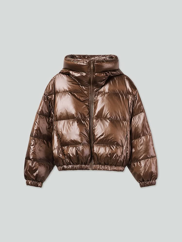 This product is crafted from high-density, ultra-fine denier nylon, featuring a bright, eye-catching sheen. The fabric is lightweight and delicate, offering a soft, silky touch against the skin, while the interior is filled with 90% goose down for a plush, warm feel. The fashionable hooded stand-up collar provides warmth and wind protection, adding a stylish edge. Zippered side pockets offer practical storage for small items while maintaining an aesthetic appeal. The elasticized cuffs provide a snug fit, enhancing the overall vibrant style.