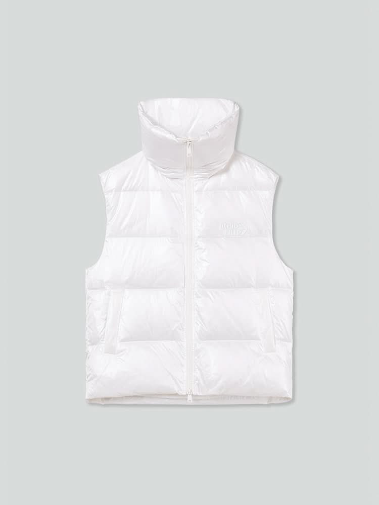 This product is made from high-density, ultra-fine denier nylon, showcasing a bright, eye-catching sheen. The fabric is lightweight and delicate, offering a soft, silky feel against the skin, while the interior is filled with 90% goose down for a plush, warm wearing experience. The cool stand-up collar, paired with a minimalist zip closure, provides warmth and wind protection. Diagonal side pockets feature a snap button detail at the opening, enhancing practicality. A tonal printed logo on the back neck adds a stylish touch to the overall design.