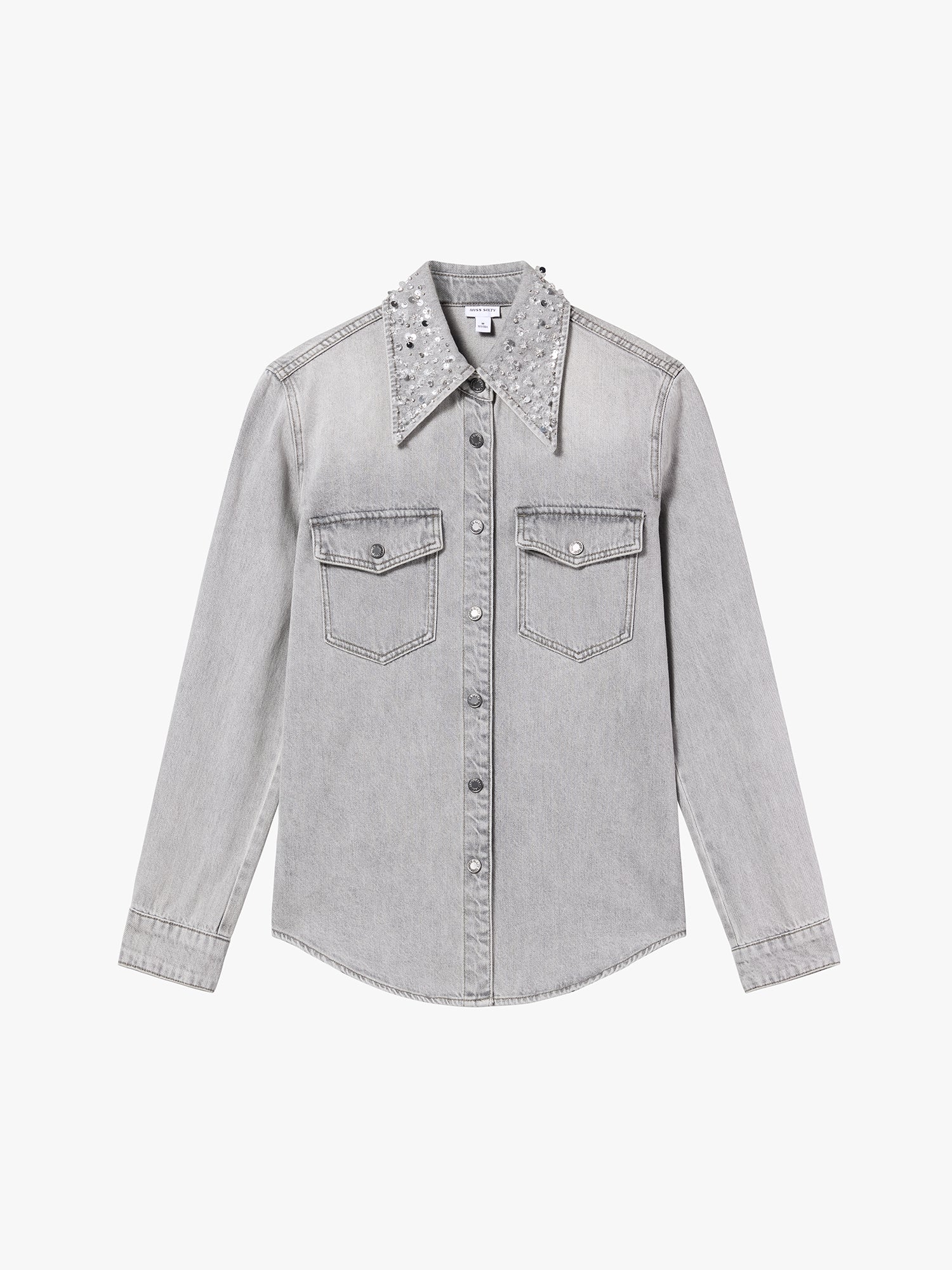 Crafted from high-end gray vintage denim with no stretch, this fabric undergoes a unique gray dyeing process, resulting in clear textures and a strong, three-dimensional feel. The pure cotton material ensures comfort and ease. The retro long-pointed collar is adorned with intricate beaded sequins, adding a sparkling touch and enhancing the garment's luxurious feel. The workwear-inspired snap button pocket design is both stylish and practical, adding depth to the overall look. The curved hemline optimizes the side profile, highlighting a sleek and clean silhouette.