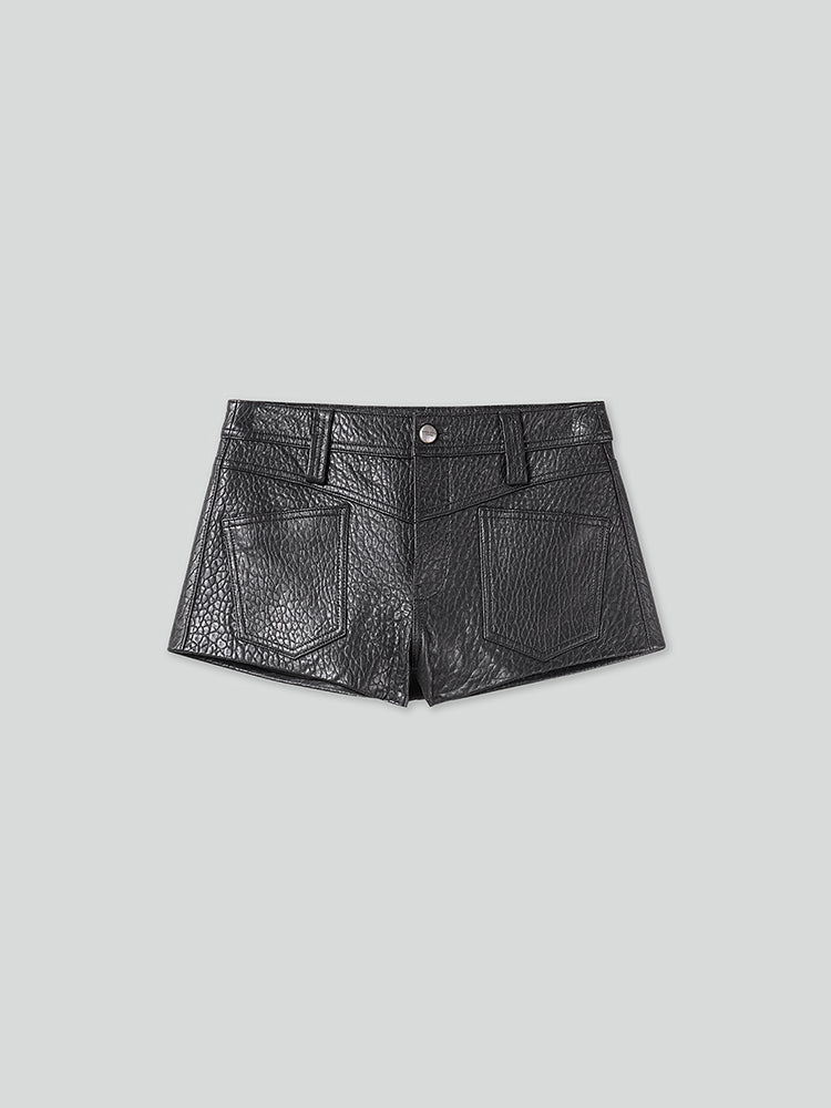 Expertly crafted from luxurious lamb leather, this piece undergoes a meticulous and intricate treatment process, resulting in a glossy, translucent surface with a fine and smooth texture. The leather offers excellent flexibility, stretch, and elasticity, showcasing its premium craftsmanship. Custom-designed textured buttons combined with a mid-rise fit comfortably wrap around the waist and abdomen, creating a visually slimming effect. The black leather patch adds an edgy touch, enhancing the perceived brand value. Decorative shield-shaped patch pockets on the front enrich the details, further elevating the overall design.