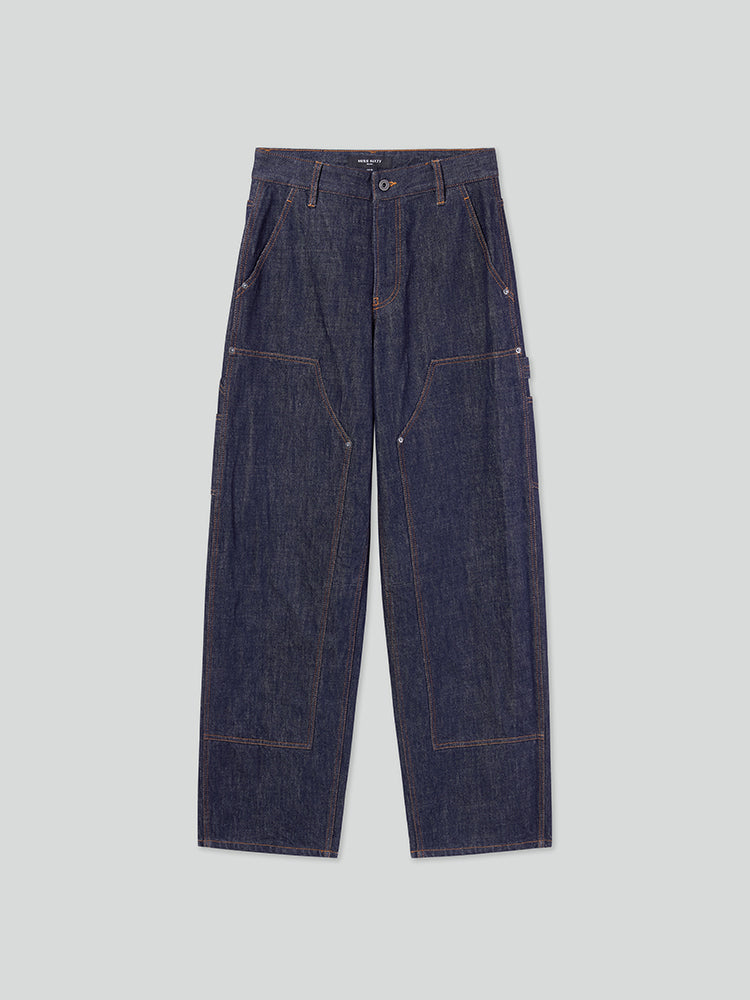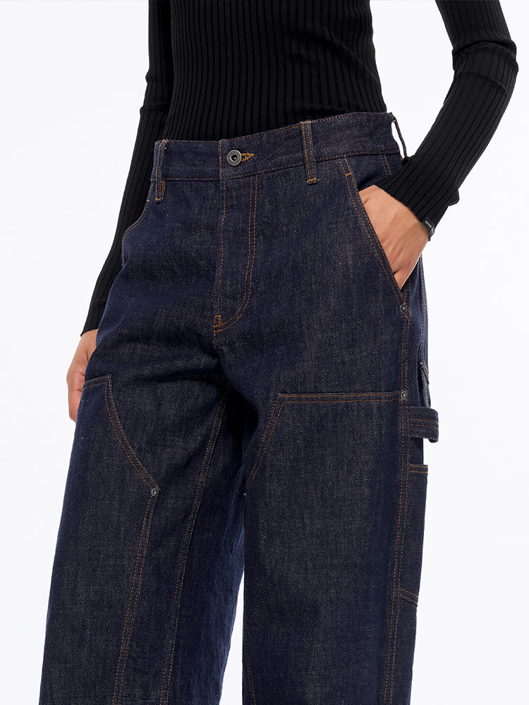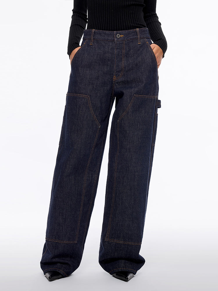Selected active cotton denim, innovatively breaking through the conventional denim material. The fabric features a natural and original color with a textured twill weave that enhances its tactile quality. It combines the retro rugged style of traditional denim with the comfort of modern denim. Crafted with an active dyeing process, it offers a structured silhouette that exudes a cool and trendy vibe. Details include a vintage brown logo leather label for added depth and an elevated aesthetic. The classic shield-shaped back pockets and utility-inspired decorative loops on one side amplify the cool factor. The loose wide-leg cut flatters the figure while concealing any problem areas, and the bright line detailing accentuates a sharp silhouette.