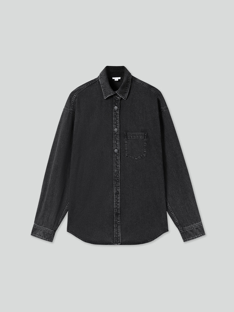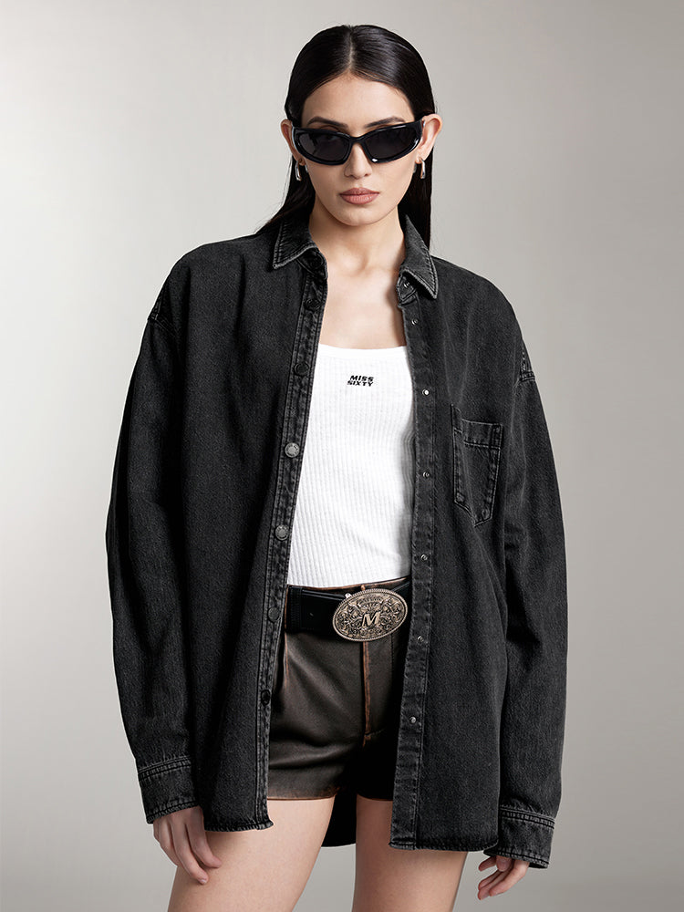 Crafted from premium non-stretch black denim, this fabric offers a comfortable feel. Through various washing processes such as enzyme wash, snowflake wash, and more, it achieves a rugged style with naturally rich tones. The fabric's slub texture gives each piece a unique, vintage look. A contrasting logo print on the back adds a bold accent, showcasing a distinctive personality. The curved hemline is tailored to enhance side body contours, highlighting a feminine silhouette. The two-button cuff design completes the look, delivering a clean and stylish finish.