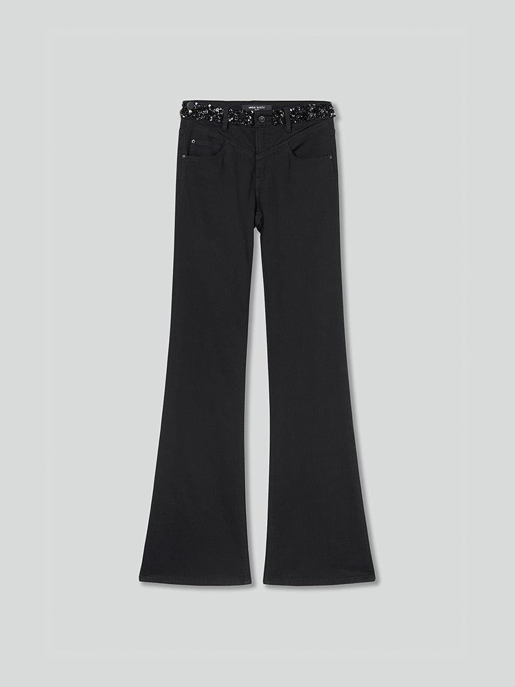 Crafted from brushed denim, this piece undergoes an active black dyeing process, presenting a deep space black visual effect with high color fastness. The lightly brushed underside adds a delicate softness, ensuring warmth and comfort when worn. The waistband features a circle of hand-sewn sequins, creating a dazzling and luxurious effect that enhances the overall look. A black leather tag complements the washed color tone, adding a stylish edge. The retro flared pant style elongates the leg proportions, showcasing a strong style statement.