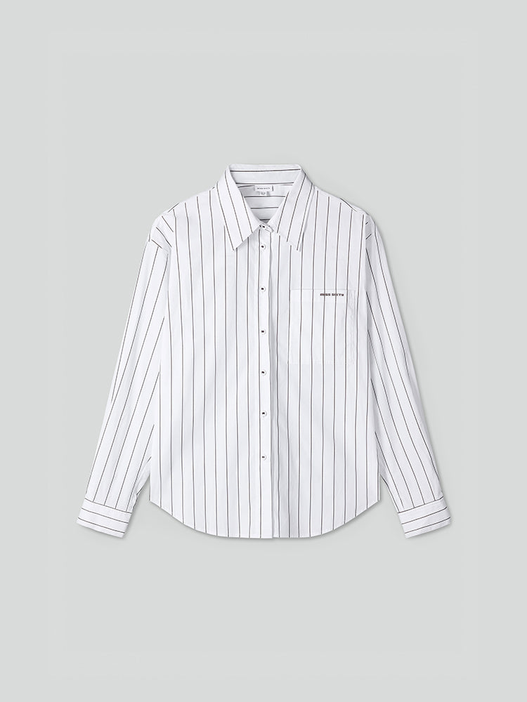 Crafted from high-quality cotton fabric using advanced weaving techniques, the surface is smooth and even to the touch. The striped pattern is fresh and natural, making the garment cool and non-sticky for a comfortable wearing experience. The embossed logo is striking and refined, with simple and elegant color coordination. The double-buttoned cuffs highlight slender arm lines. The stylishly designed curved hem subtly accentuates the waist, effortlessly showcasing a chic look.