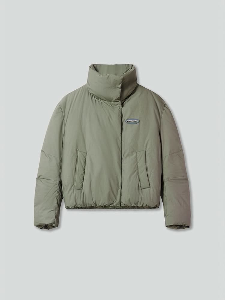 This product is made from coated cotton poplin, crafted using specialized textile techniques to create a distinctive slub texture. The rich feel of the fabric, combined with the lightweight coating, offers a functional style while retaining the softness of cotton, ensuring comfortable wear without overheating. The fashionable stand-up collar features a contrasting logo patch on the chest, adding a playful touch. The front closure uses a snap-button design for simplicity and ease of wear. The side pockets are both stylish and practical, while the drawstring detail at the hem gently shapes a warm, trendy silhouette.