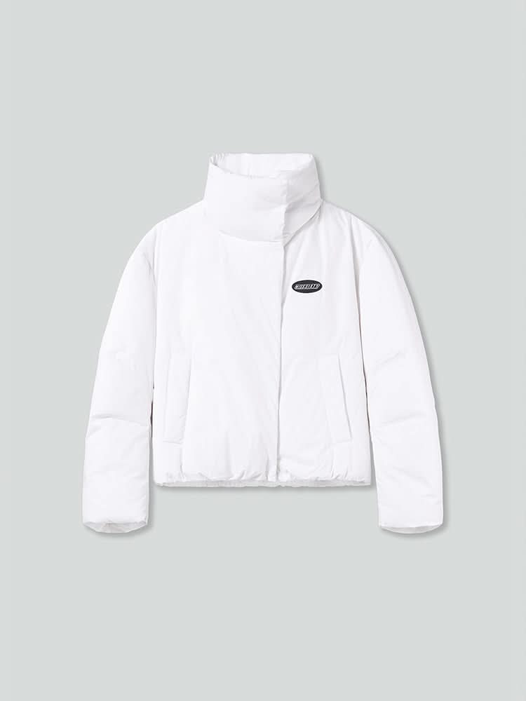 This product is made from coated cotton poplin, crafted using specialized textile techniques to create a distinctive slub texture. The rich feel of the fabric, combined with the lightweight coating, offers a functional style while retaining the softness of cotton, ensuring comfortable wear without overheating. The fashionable stand-up collar features a contrasting logo patch on the chest, adding a playful touch. The front closure uses a snap-button design for simplicity and ease of wear. The side pockets are both stylish and practical, while the drawstring detail at the hem gently shapes a warm, trendy silhouette.