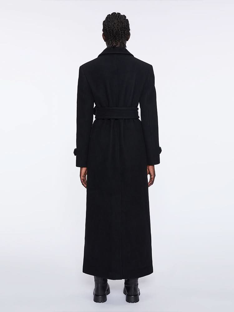 The classic Melton is a type of double-faced wool fabric characterized by its smooth, neat surface and sturdy structure. The material is a blend of wool and nylon, offering a rich, soft texture with elasticity. The finished garment appears full and structured, enhancing its elegant demeanor. The classic suit lapel design and tailored cuts create a sophisticated dressing atmosphere. Paired with a matching belt, it effortlessly cinches the silhouette, elevating the overall look. The clean hem and back vent add an elegant touch, enhancing its modern appeal.