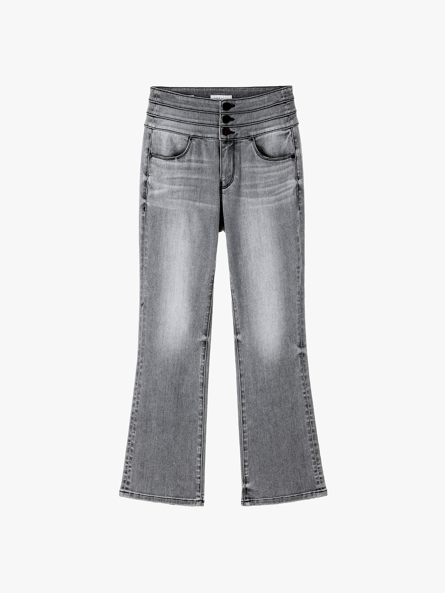 Carefully selected stretch denim fabric offers comfortable coverage and a non-constricting fit. The three-horizontal stitching structure provides comfortable waist compression, elongating the leg proportion. Featuring slightly angled rear patch pockets adorned with double seam lines, enhancing the buttocks' shape. Mid-length flared silhouette.