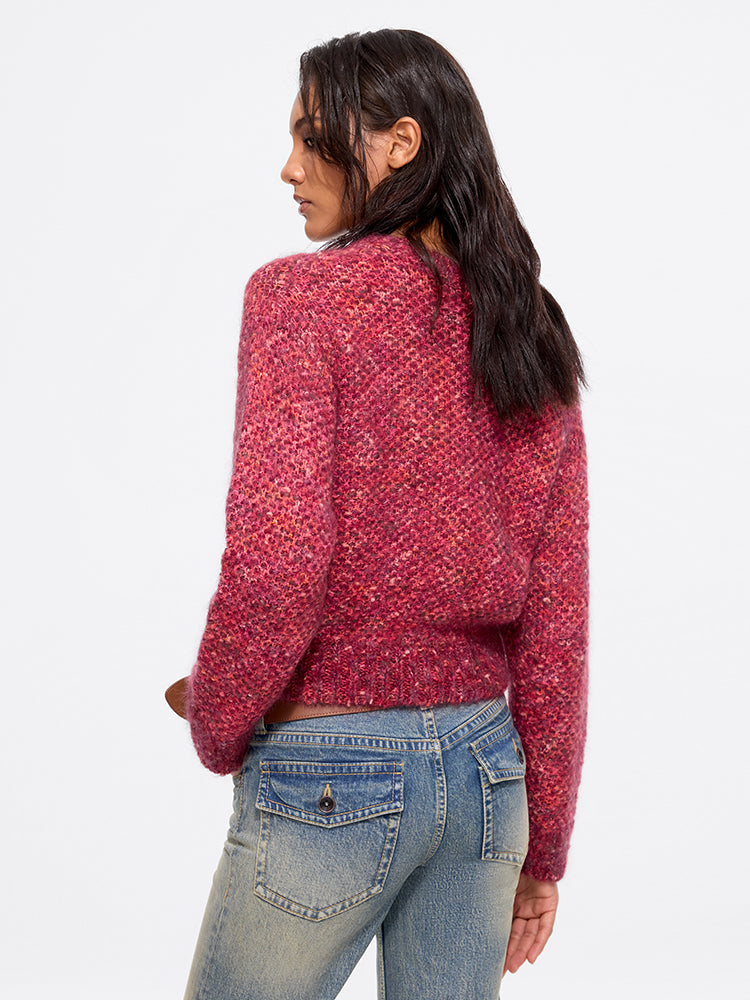 Crafted from premium Italian mohair-blend yarn, this sweater features vibrant, harmonious colors and a rich, textured finish. The fine, elastic mohair fibers and looped effect create a soft, fluffy fabric with enhanced depth and structure, showcasing exceptional craftsmanship. The thick ribbed crew neck and hem provide a polished fit, while subtly tapered cuffs accentuate the arms for an elegant silhouette.