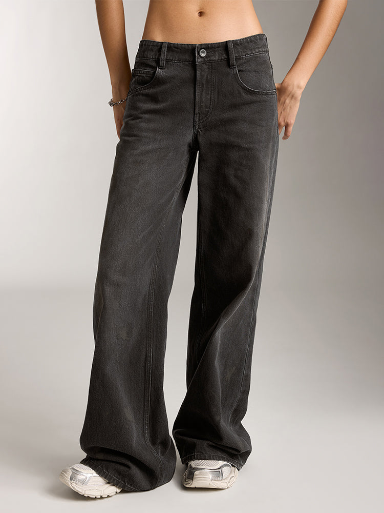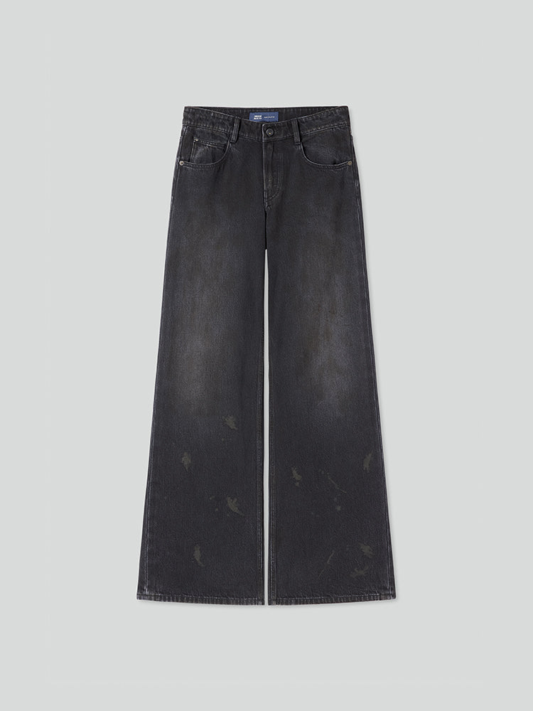 Selected pure cotton sulfur-dyed black denim fabric, featuring a vintage style with clear twill texture, offers a firm and full touch. The rain dot slub effect adds depth and dimension. Multiple washing and processing techniques, including enzyme washing and stain treatments, create a unique fashionable effect for each piece, capturing the essence and charm of vintage denim. The jeans feature a precisely tailored low-rise fit, with custom buttons and a zip fly, highlighting high-quality details. The black label, combined with a contrasting logo pattern, presents a natural crinkle effect, making it trendy and eye-catching. The straight-leg cut is flattering for various body types, and the fabric's distressed, mud-dyed appearance enhances its rich, layered details.