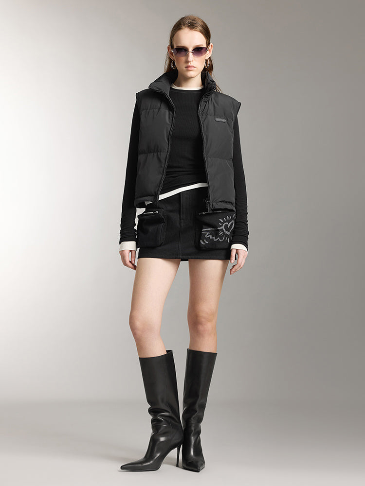 Crafted from pure cotton denim, this fabric features a crosshatch slub texture with clear, glossy weaving lines, offering a smooth and refined touch with a tight structure for a comfortable fit. The distressed wash process creates a layered vintage color, giving the fabric a natural worn-in look and enhancing its retro yet fashionable tone. Custom-designed buttons from the collaborative collection pair with a textured zip-up placket for a sleek appearance. Cracked print detailing adds a weathered, nostalgic vibe, while symmetrical, cargo pockets enrich the design, giving it a bold, edgy flair.