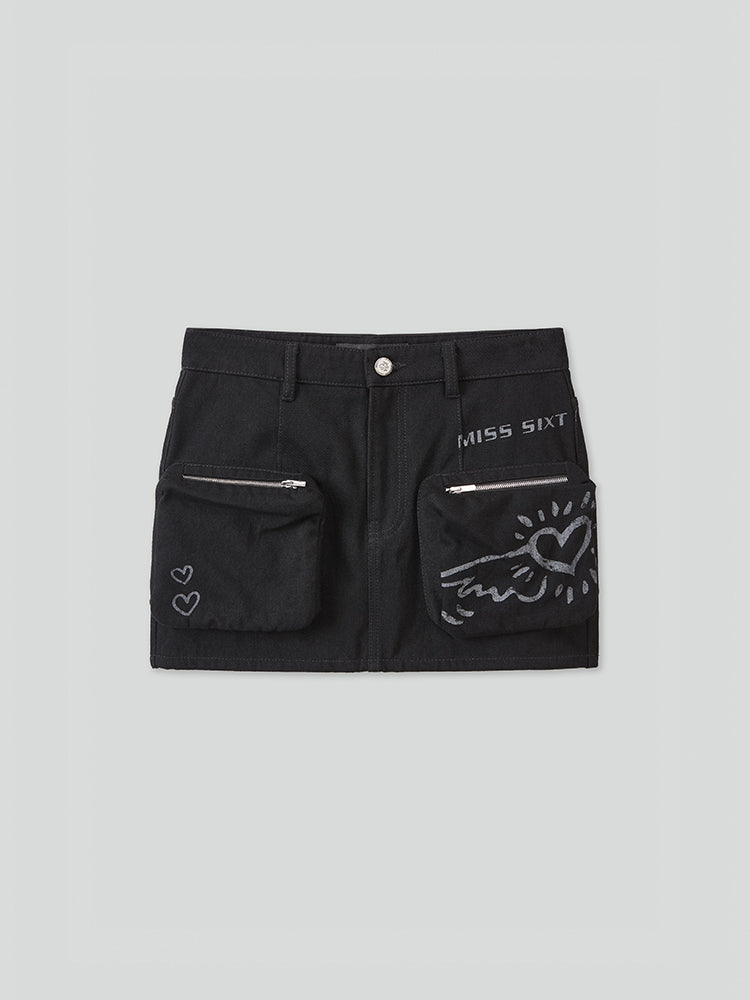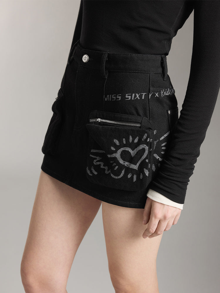 MISS SIXTY X KEITH HARING CAPSULE COLLECTION CARGO STYLE DENIM SKIRT WITH POCKETS