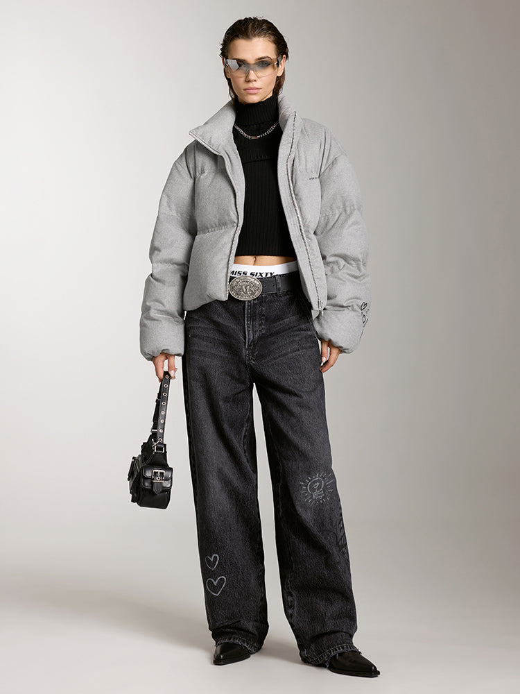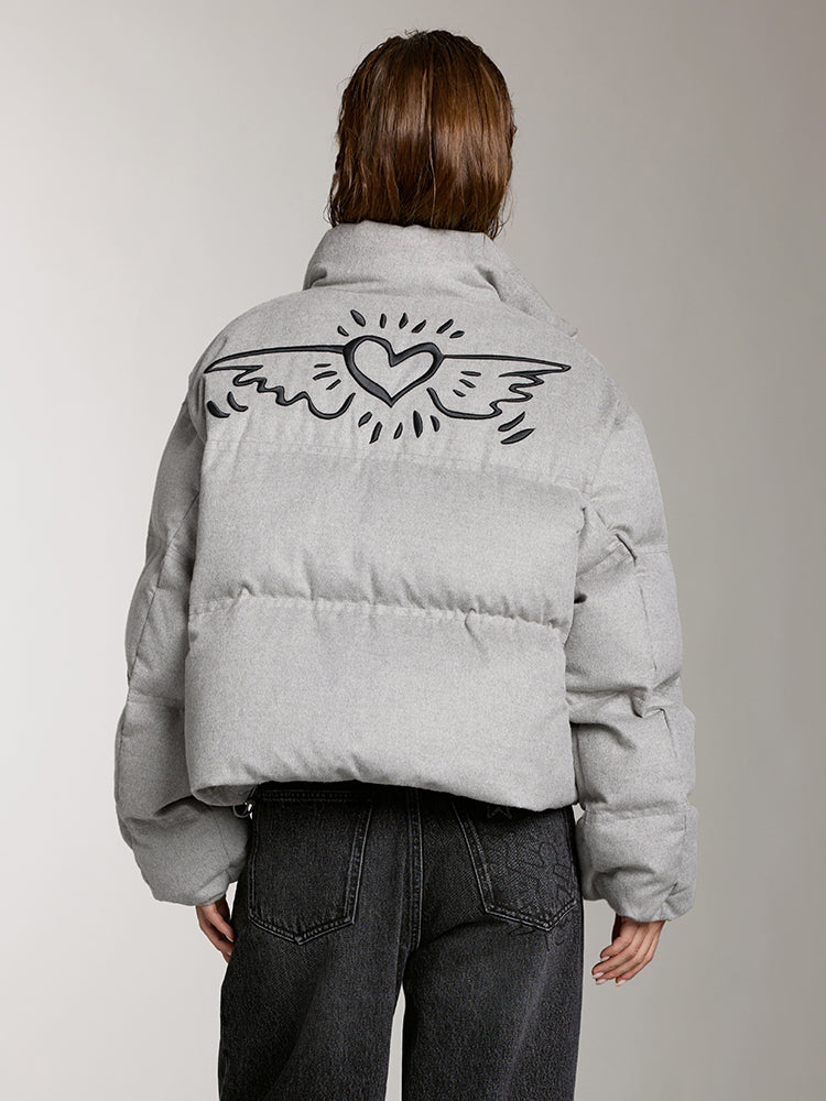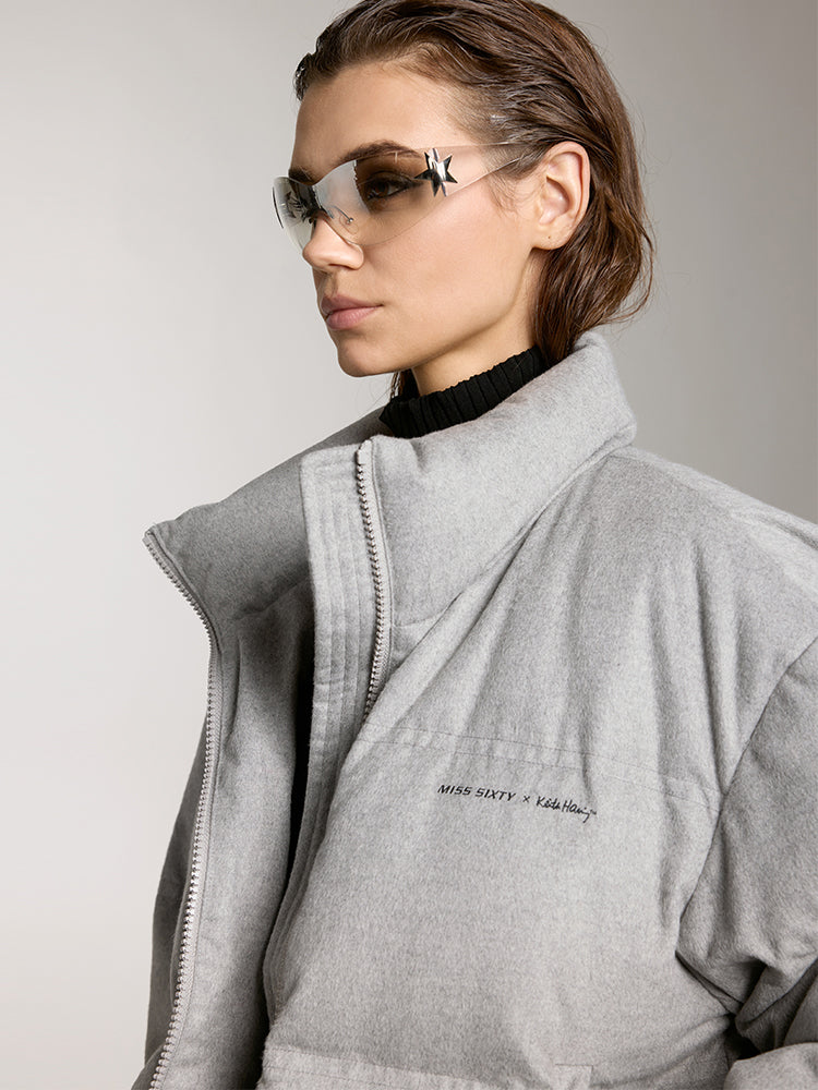 Crafted from a premium wool blend fabric, this piece features a soft and naturally lustrous surface. The blended yarns offer a delicate, smooth feel with a lightweight and tightly structured fabric. Filled with 90% duck down, it provides a fluffy, lightweight warmth for a cozy wearing experience. The minimalist stand collar design wraps comfortably around the neck, offering gentle warmth and wind protection. The collaborative logo, presented as embroidery, enhances its premium appeal with an elevated touch. Dual angled side pockets add functional detail, boosting overall practicality.