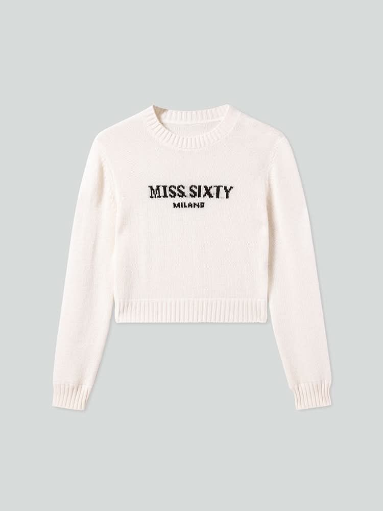 Crafted from premium sheep wool blended with cashmere, the fine, soft fibers give the fabric a plush and delicate feel, ensuring a skin-friendly and comfortable experience. The garment is lightweight and warm to the touch, providing effortless wear. The integrated knit jacquard lettering in contrasting colors adds a striking visual element, highlighting exquisite craftsmanship. The cropped design with a subtly cinched silhouette creates a flattering fashion-forward proportion. The ribbed cuffs offer a relaxed and easygoing vibe, completing the look with a sense of laid-back comfort.