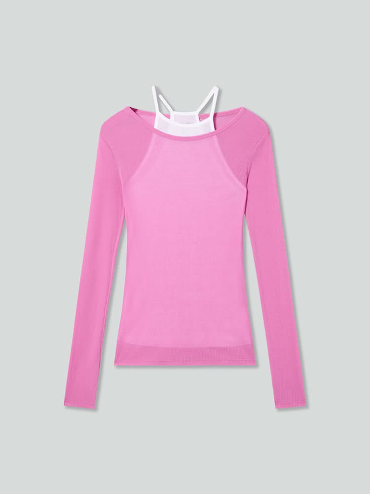 The fabric is crafted using twisted yarn and a 2*2 weave technique, blended with nylon fibers for a structured, tailored feel. The surface features subtle ribbed textures, offering a delicate, soft touch and comfortable fit. The color-blocked inner layer design, along with soft, comfortable straps, frames the shoulders and neckline beautifully. The slightly tapered waist and structured hem create a smooth, relaxed silhouette that fits the body without being too tight. The clean long sleeves gently wrap the arms, elongating them and enhancing the minimalist look.