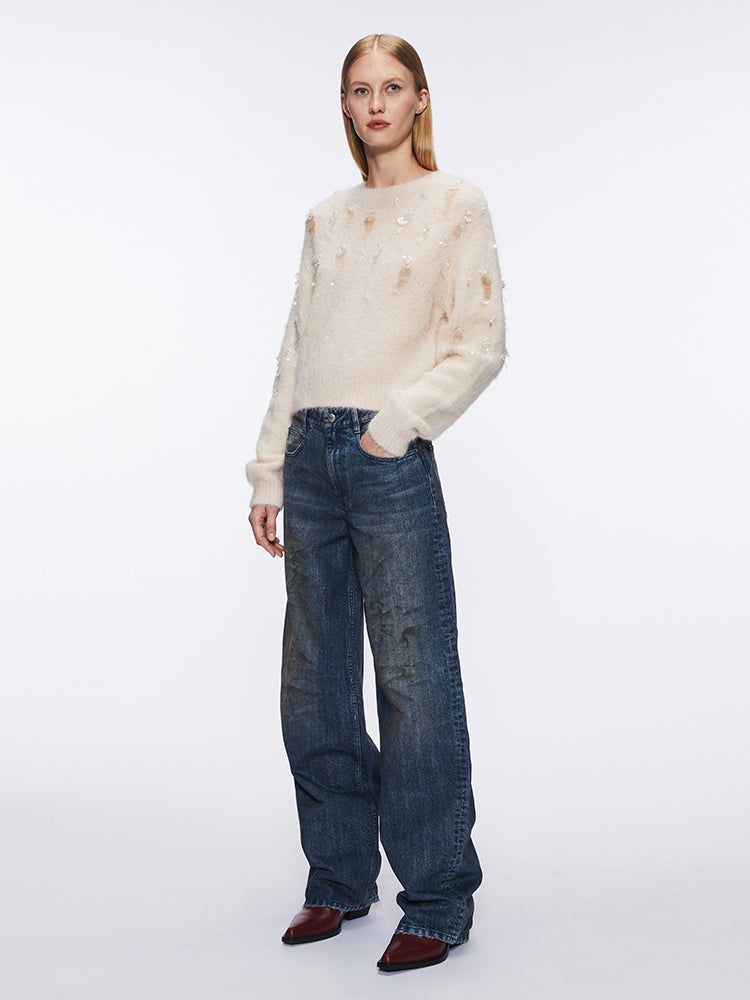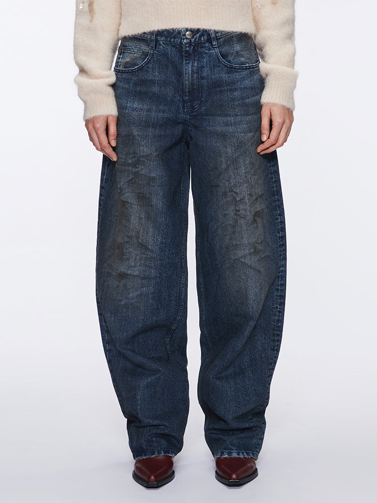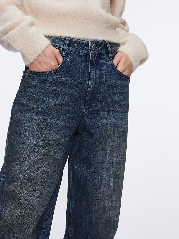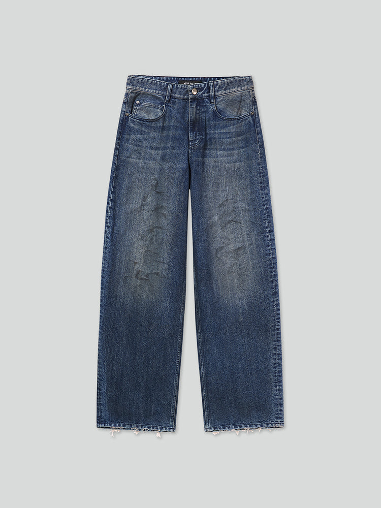 This product features high-quality denim woven with silver threads, creating a shimmering visual effect. The fabric has a clear texture and a sturdy feel, subtly exuding luxury. Through various treatments such as enzyme washing, hand scraping, edge grinding, and staining, each piece achieves a unique and striking appearance that showcases the vintage charm of denim. The distressed wash effect at the waist enhances its cool vibe, embodying a retro, post-apocalyptic aesthetic. This seasons upgraded leather patch, with a bold, raised logo, elevates the brands premium appeal. The straight-leg cut, adorned with raw edge detailing, captures a carefree, urban style.