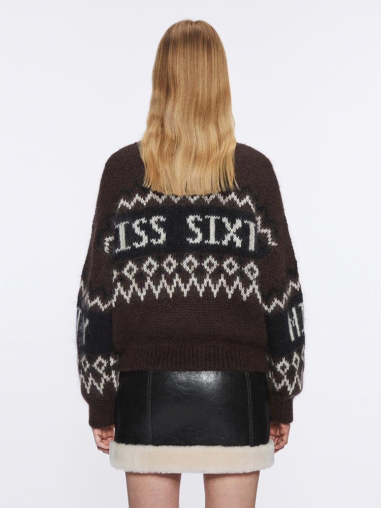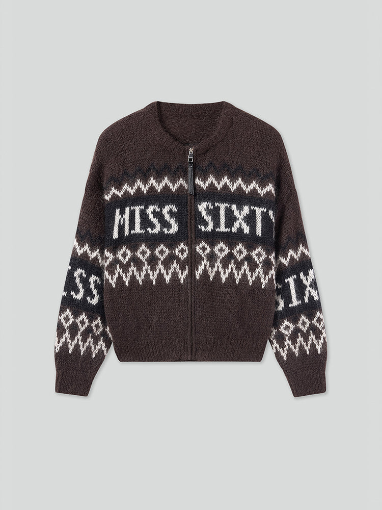 This piece is crafted from fine kid mohair, resulting in a chunky textured yarn that is soft and fluffy with a delicate, elongated feel. The color palette features a subtle dip-dye effect, with vintage tones distributed randomly throughout the yarn, creating a stylish and dynamic color gradient. The leather zipper pull adds a touch of sophistication against the soft knit backdrop, enhancing the overall refined aesthetic. A contrasting jacquard logo effortlessly stands out, providing a striking detail. The cuffs are finished with ribbed detailing, allowing for a relaxed and comfortable fit.