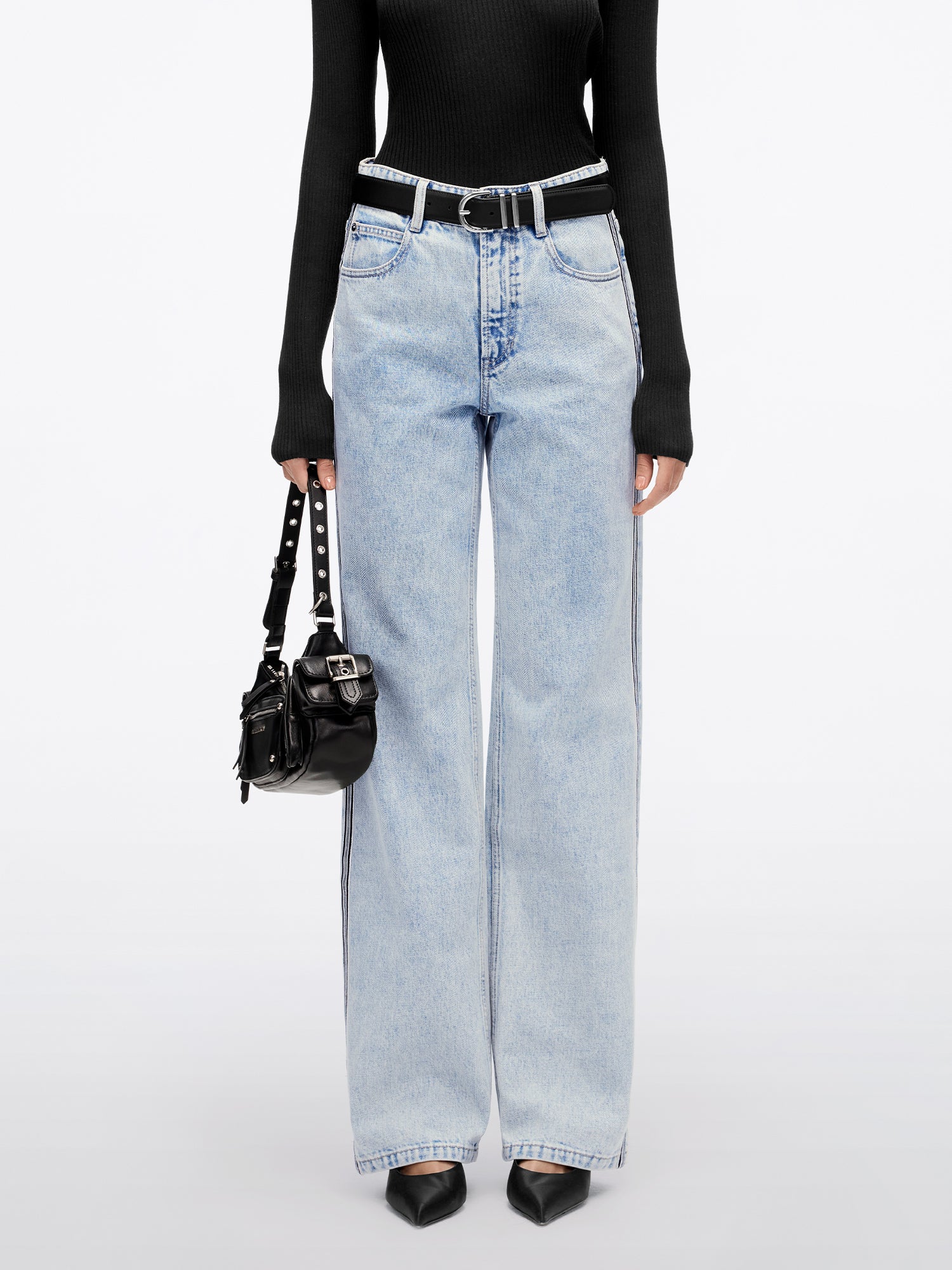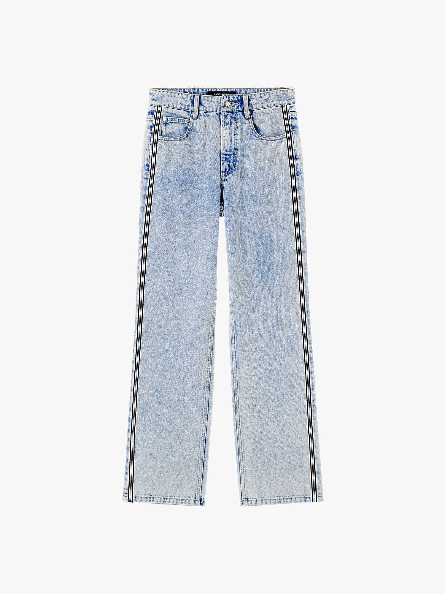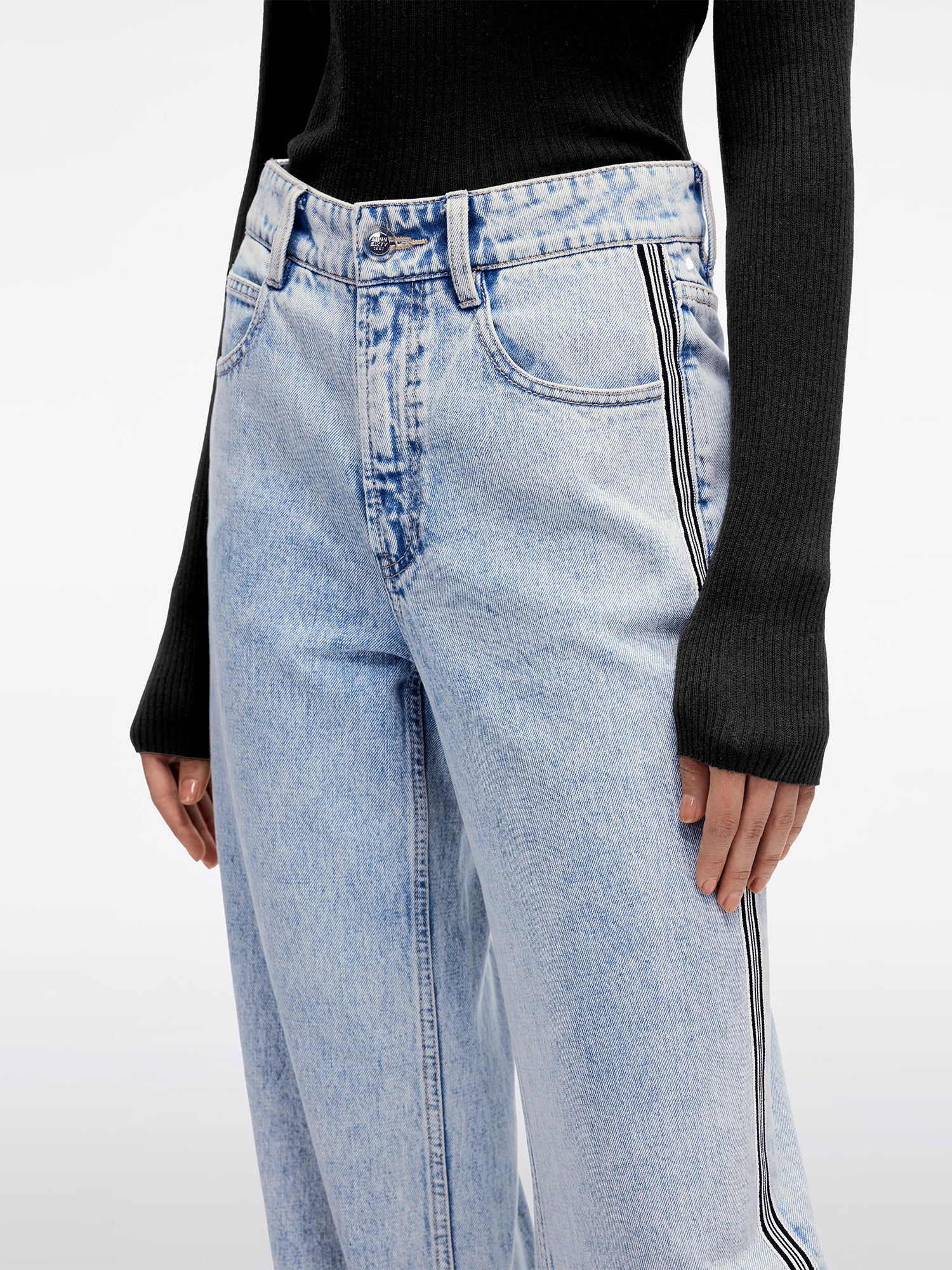 Selected Egyptian cotton denim fabric, full touch, broad silhouette, and retro color. Interpreting the sports trend with retro aesthetics, the double-sided stripe splicing stimulates the vitality of denim, visually stretching the leg lines vertically, releasing the retro sports style.